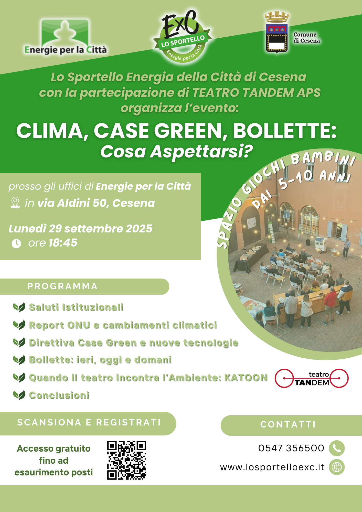 Una serata dove informazione e divertimento si uniranno. I nostri esperti parleranno di concetti chiavi per comprendere obiettivi e l’impatto delle nostre scelte e imparare a dare la priorità alle azioni più efficaci per la riduzione dei consumi A seguire, ci sarà uno spettacolo di improvvisazione teatrale comica a cura di Teatro Tandem, scuola e compagnia d’improvvisazione teatrale a Cesena. Le storie e le risate nasceranno in diretta, ispirate dai vostri stessi suggerimenti sulle tematiche ambientali. In conclusione ci sarà un brindisi per festeggiare 8 anni di attività de Lo Sportello ExC. L’ingresso è libero e gratuito fino ad esaurimento posti, per registrarsi all’evento: https://forms.gle/xjsKJpx845dq4vPZ8 Locandina: Vi aspettiamo per riflettere e sorridere insieme.